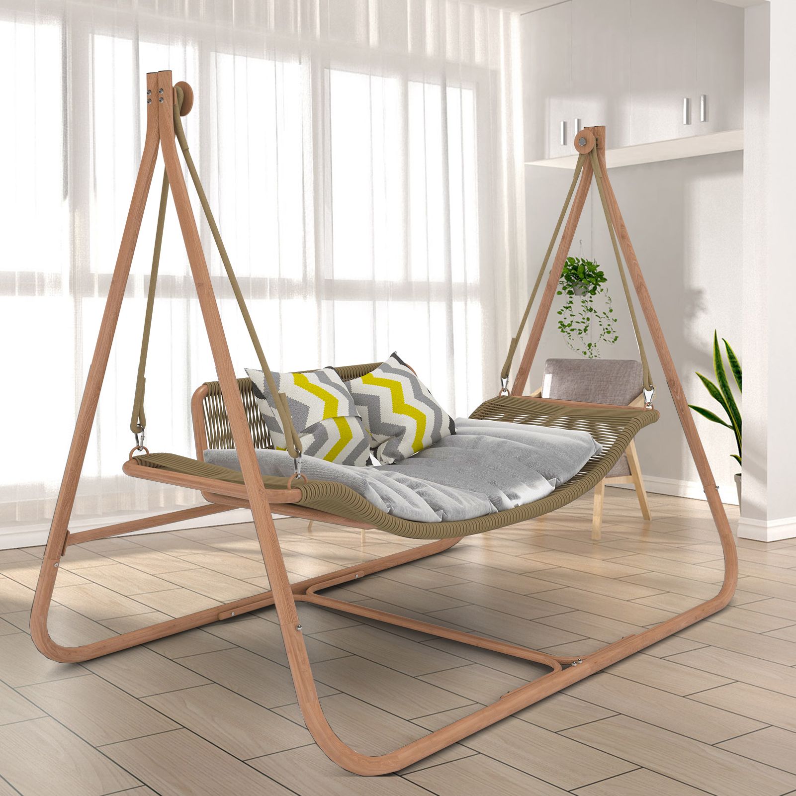 2.Stable and Durable -Triangle bracket structure, sturdy and stable; Alloy frame, high corrosion resistance paint film, imitation wood grain surface, both durable and beautiful, fearless of sun and rain; PE wire rope woven rattan, with strong elasticity and not easy to fade; And paired with high load-bearing crane ropes, stable swinging, safe and silent.